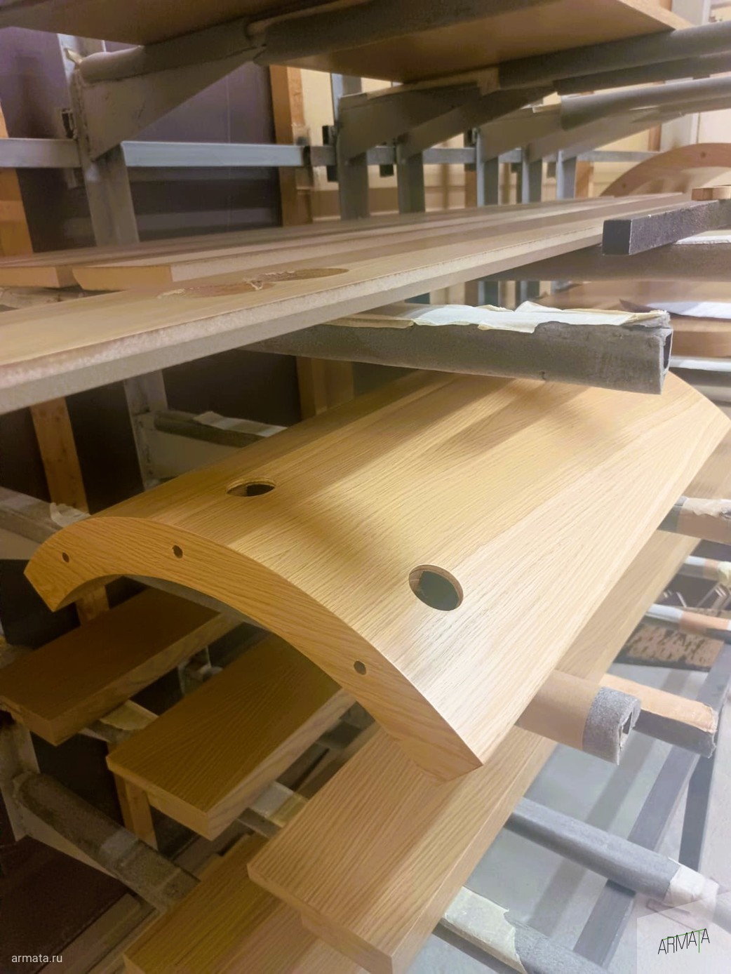 Сложность обработки: Работа с массивом, шпоном или фанерой требует точных расчётов, большой опыт работы, а также особых методов прессовки и гибки материалов.