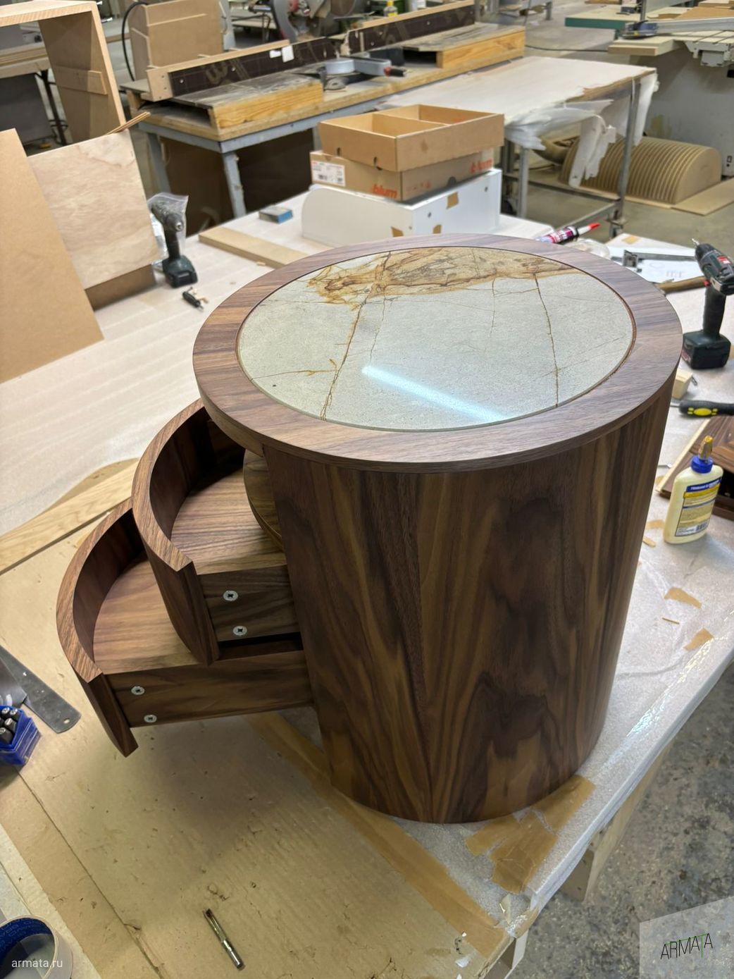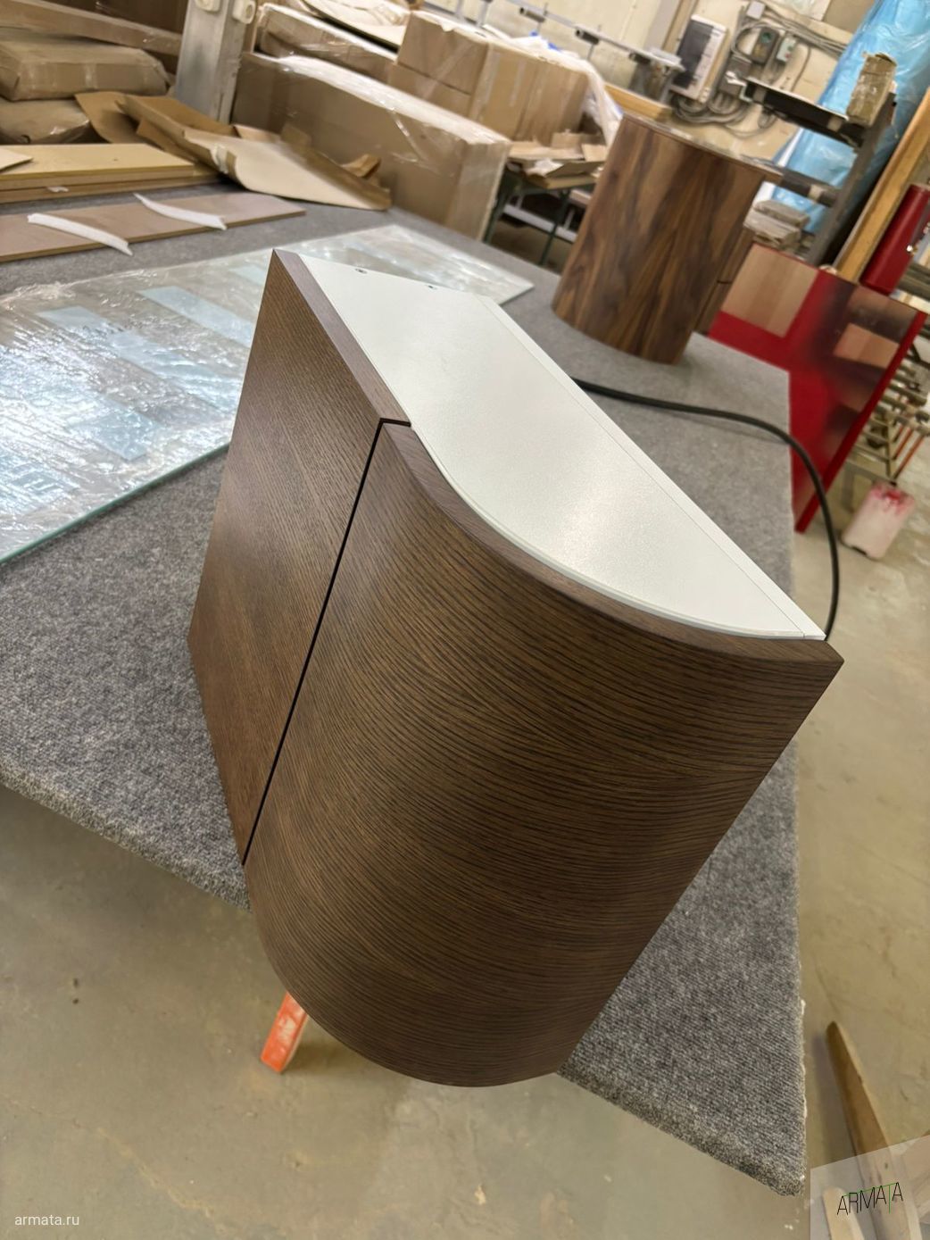 - полукруглые и круглые тумбы и тумбочки из фанеры, МДФ и шпона