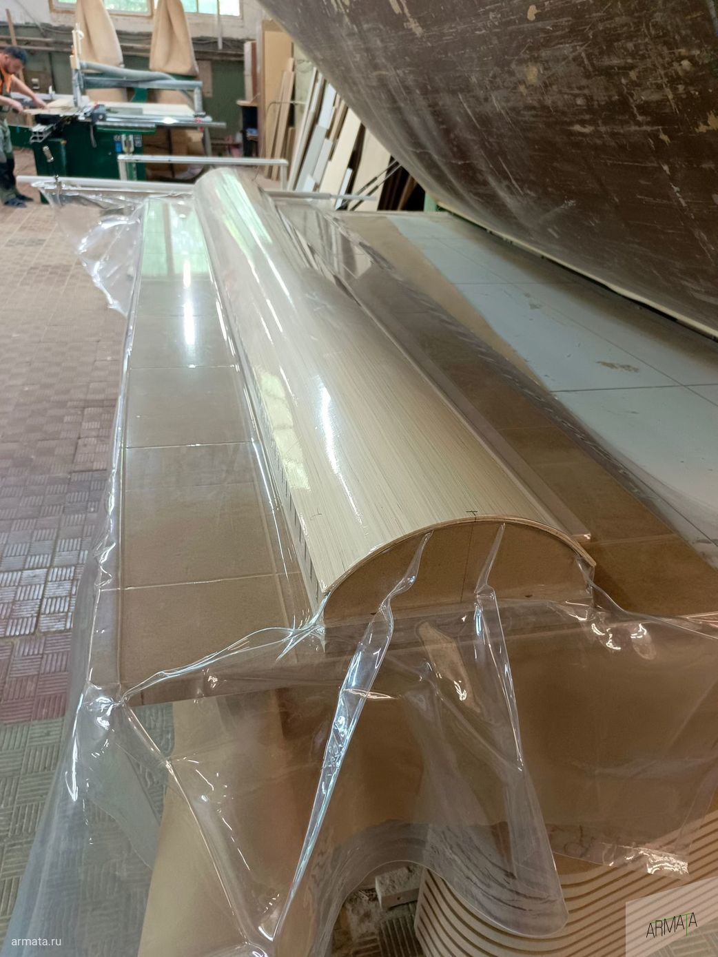 Фанера нарезается на заготовки и изгибается под заданным радиусом с помощью заранее изготовленных болванок или шаблонов. Чаще всего такие шаблоны мы изготавливаем с помощью высокоточных станков с ЧПУ.