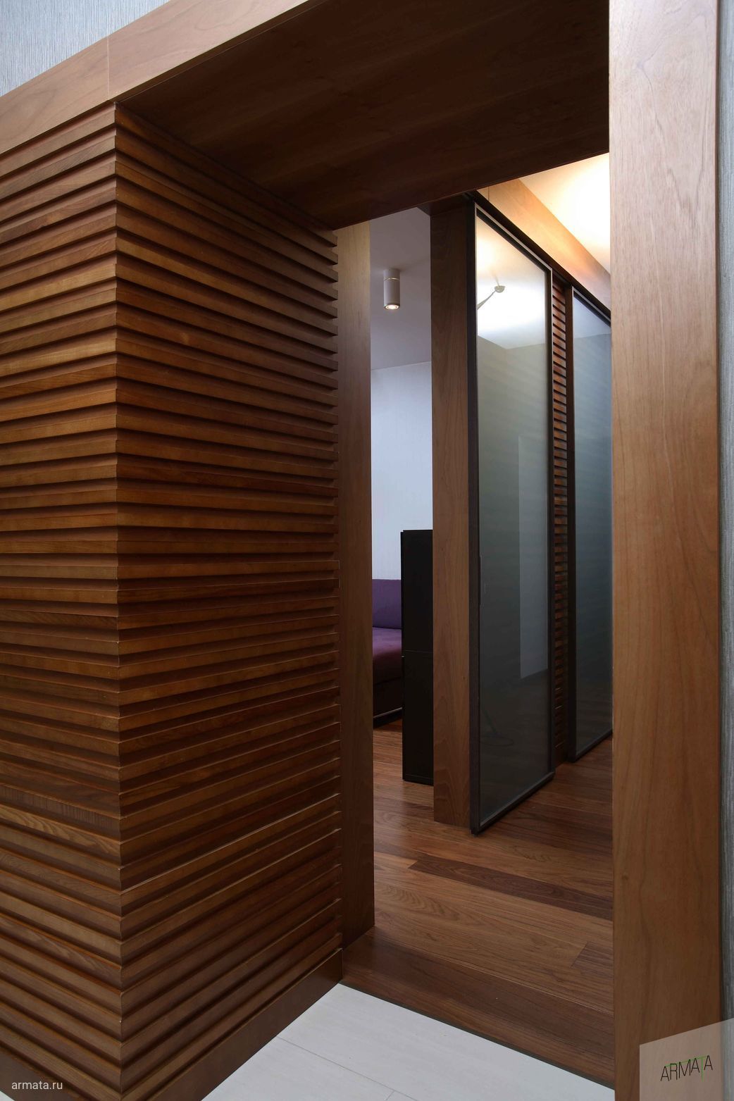 Если кухня и санузлы выполнены преимущественно в бело-серой гамме, то в спальне и гостиной уютно благодаря паркетным полам и декоративным элементам оформления стен – в шпоне ореха. Американский орех – настолько красивая древесина, что было бы кощунством использовать даже минимальную тонировку. Только бесцветный лак – подчеркнуть природную красоту ореха. Именно это решение и выбрали архитекторы – естественный орех – для паркетных полов, оформления стен и дверных проемов.