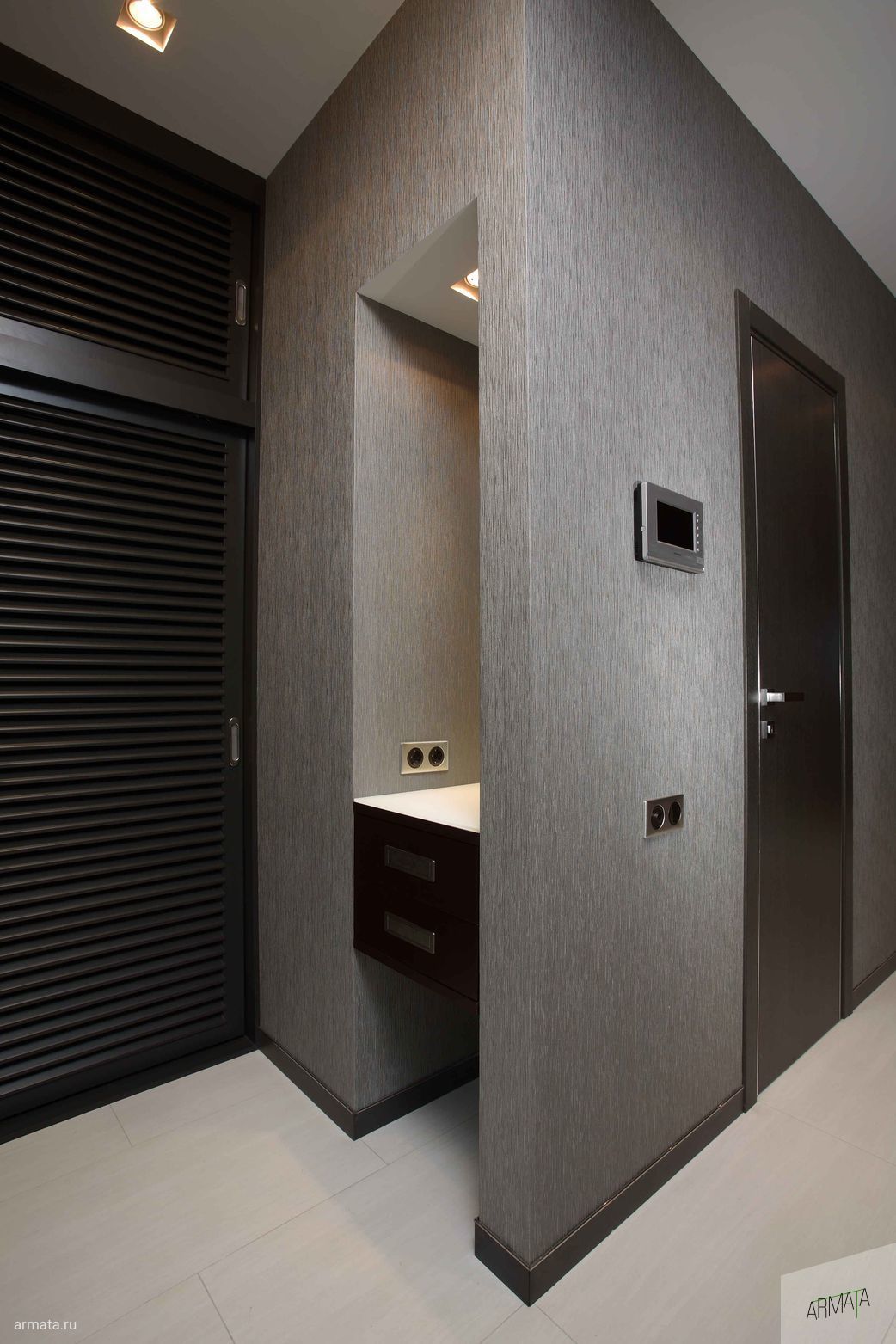 Для ванной комнаты по чертежам бюро мы изготовили шкаф во всю стену с зеркальными дверцами. – Хороший способ зрительно увеличить пространство вдвое! В холле наша работа – гардероб с раздвижными «дышащими» дверьми, выкрашенными эмалью цвета антрацит. А также шкаф для обуви в зоне прихожей.